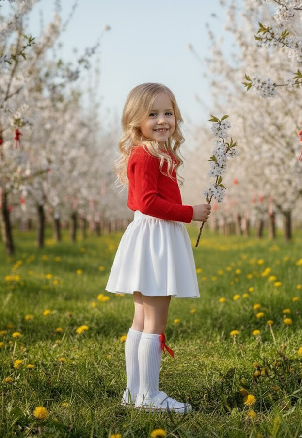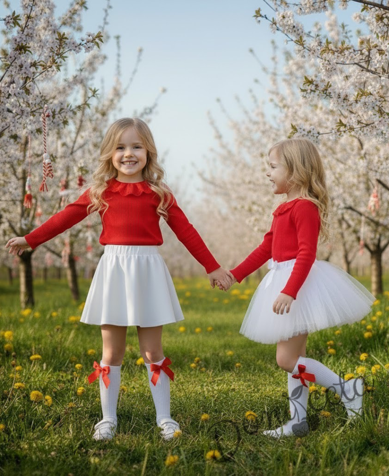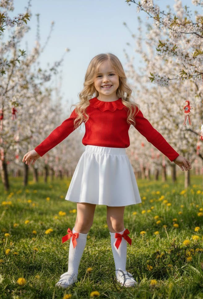 Комплект за момиче от 2 части-пола клош от трико Роси в бяло и блуза с дълъг ръкав в червено с дантела