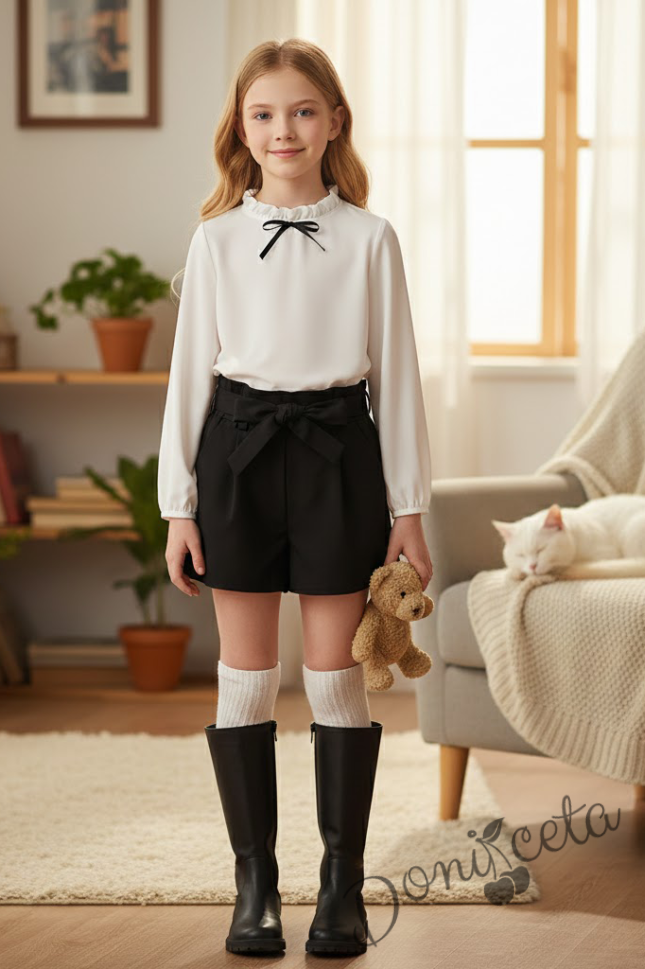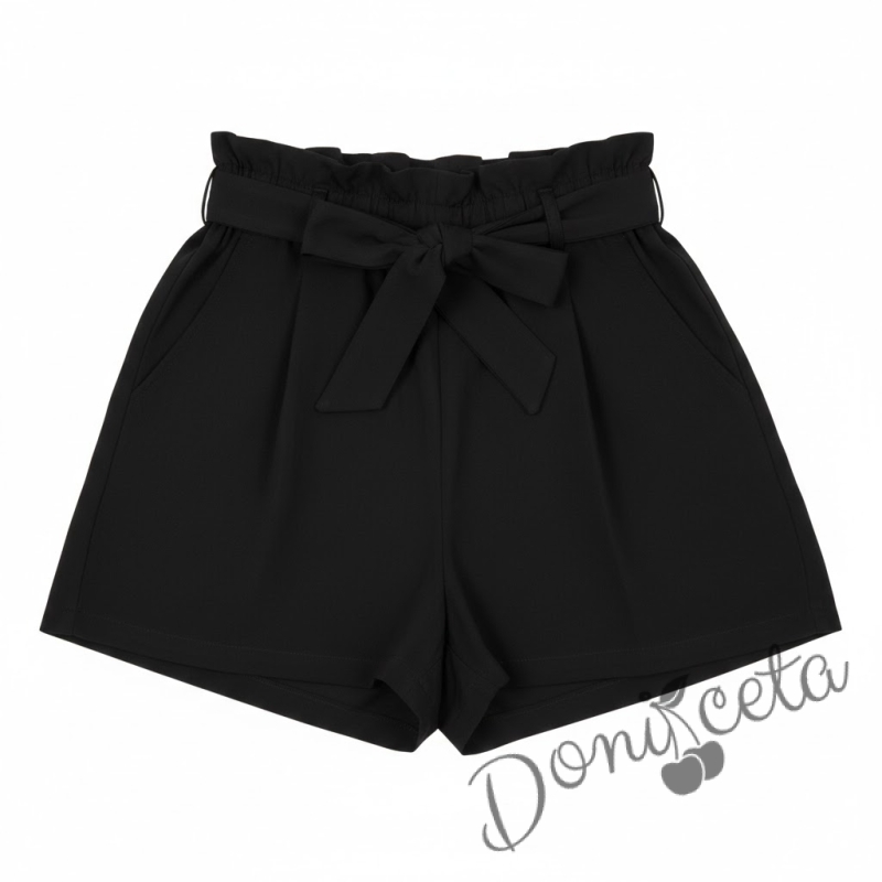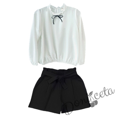 Комплект от 2 части- къси панталони в черно с ластик и колан, риза в бяло с панделка