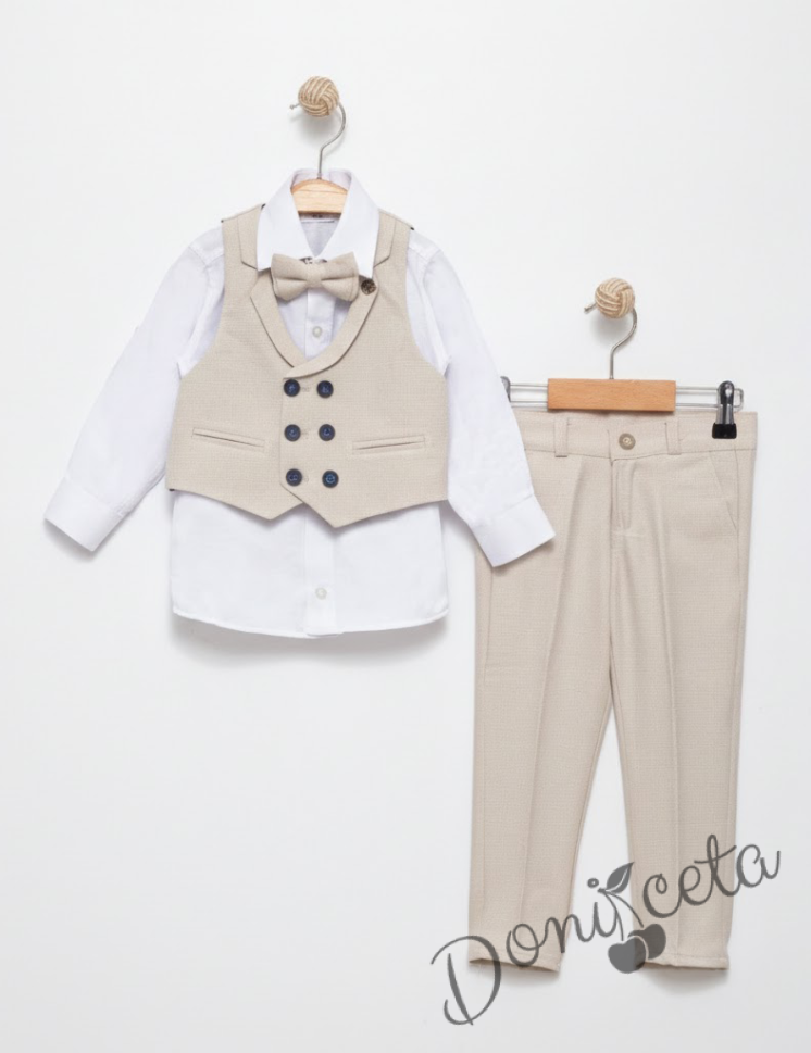 Спортно-елегантен костюм ТЕРИ за момче от 4 части в бежово - риза в бяло, сако с джобове, панталон с връзки и папийонка