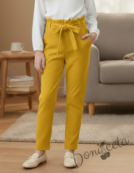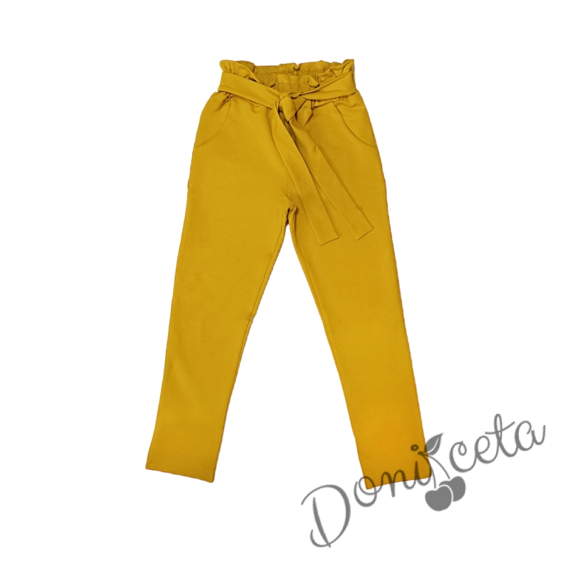Детски панталон за момиче в цвят горчица с висока талия и колан