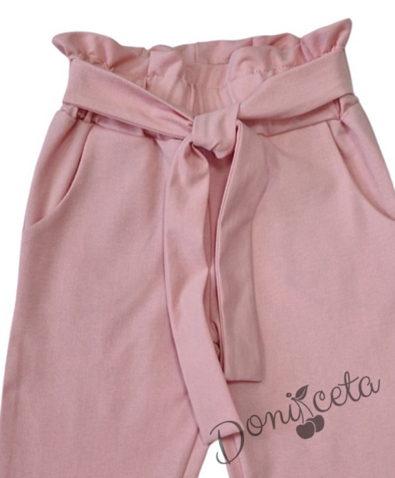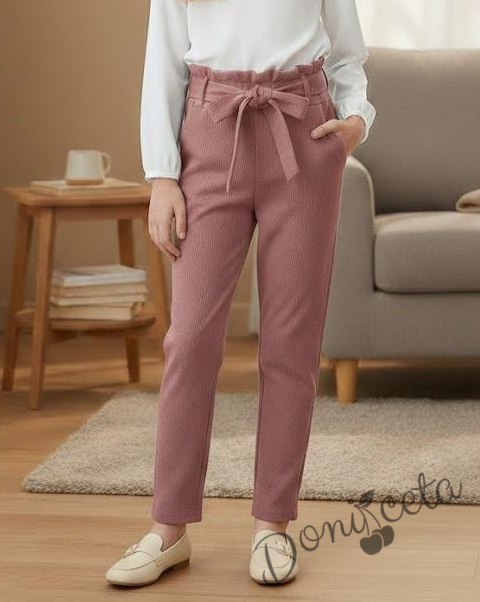 Детски панталон за момиче в цвят пепел от рози с висока талия и колан