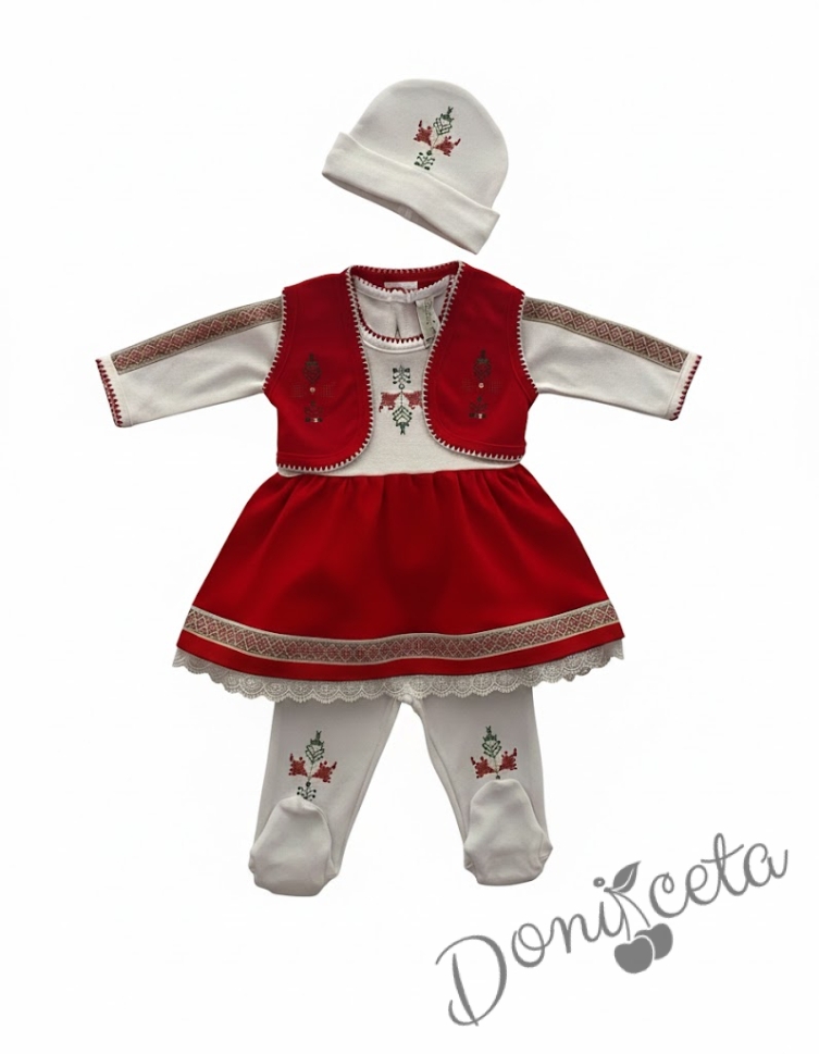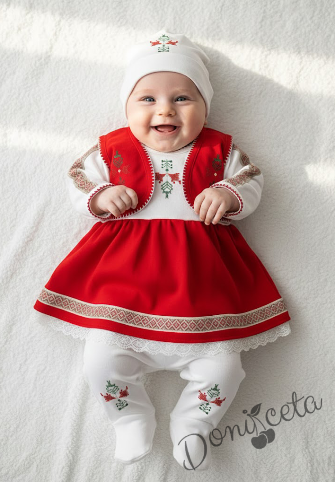 Начало БЕБЕ МОМИЧЕ Бебешки комплект за момиче от 4 части- рокля в бяло и червено, елече в червено, ританки и шапка в бяло