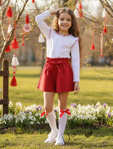 Комплект за момиче от къси пола-панталони в червено и блуза в бяло с дълъг ръкав с къдрички обкрайчени в червено