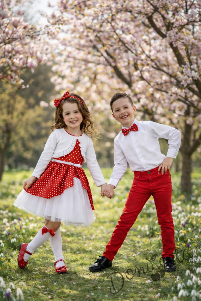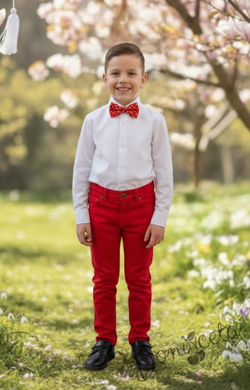 Комплект за момче от 3 части-бяла риза с дълъг ръкав, панталон в червено и папийонка в червено на бели точки