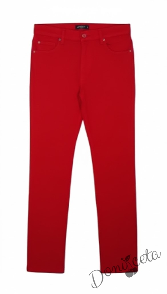 - Панталон в червено:Много стилен и модерен панталон за момче в червен цвят.Дънките се съчетават много добре с блузка с копчета и сако от трико в цвят по избор.