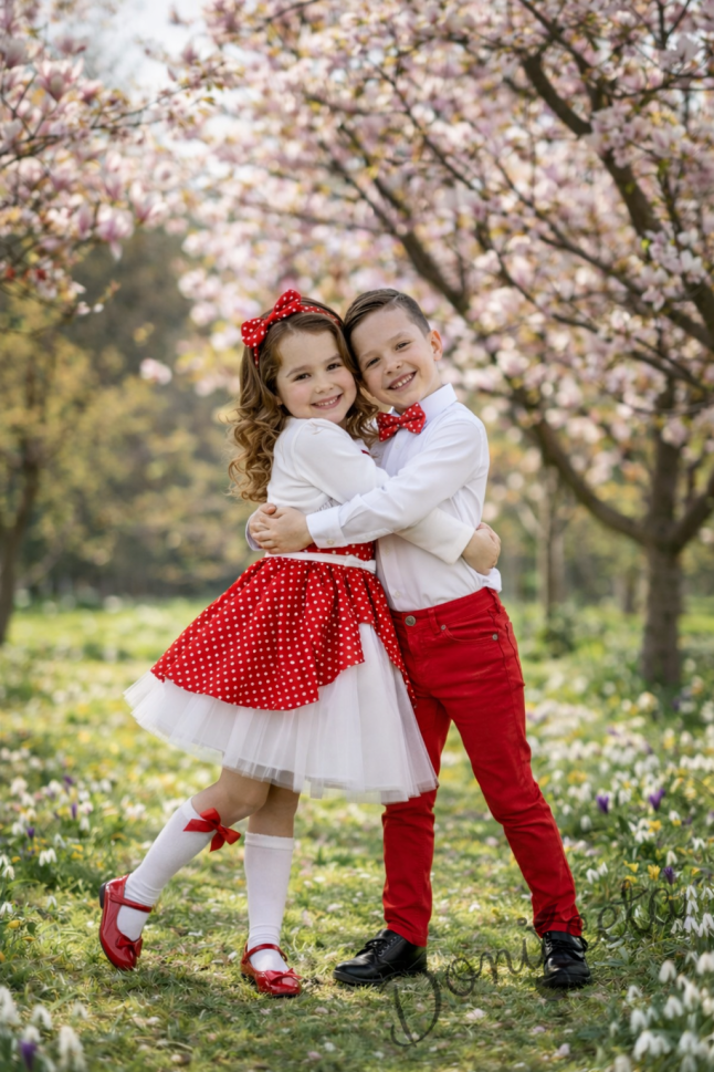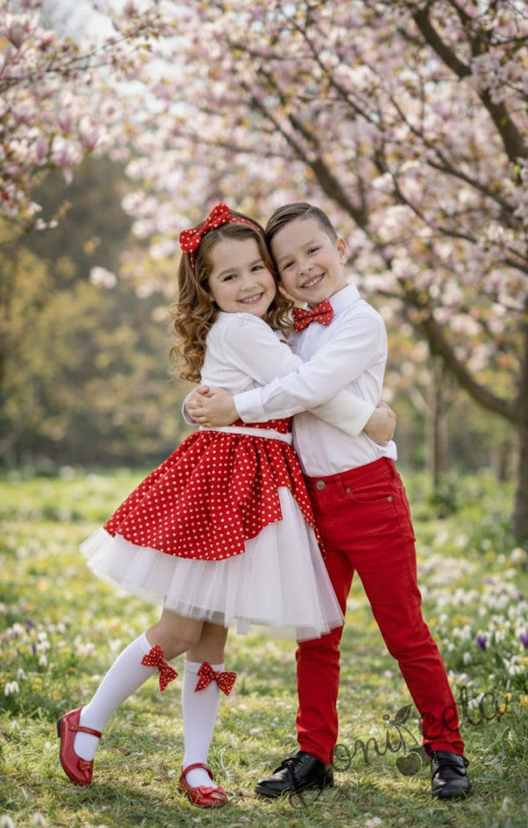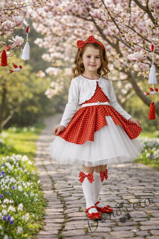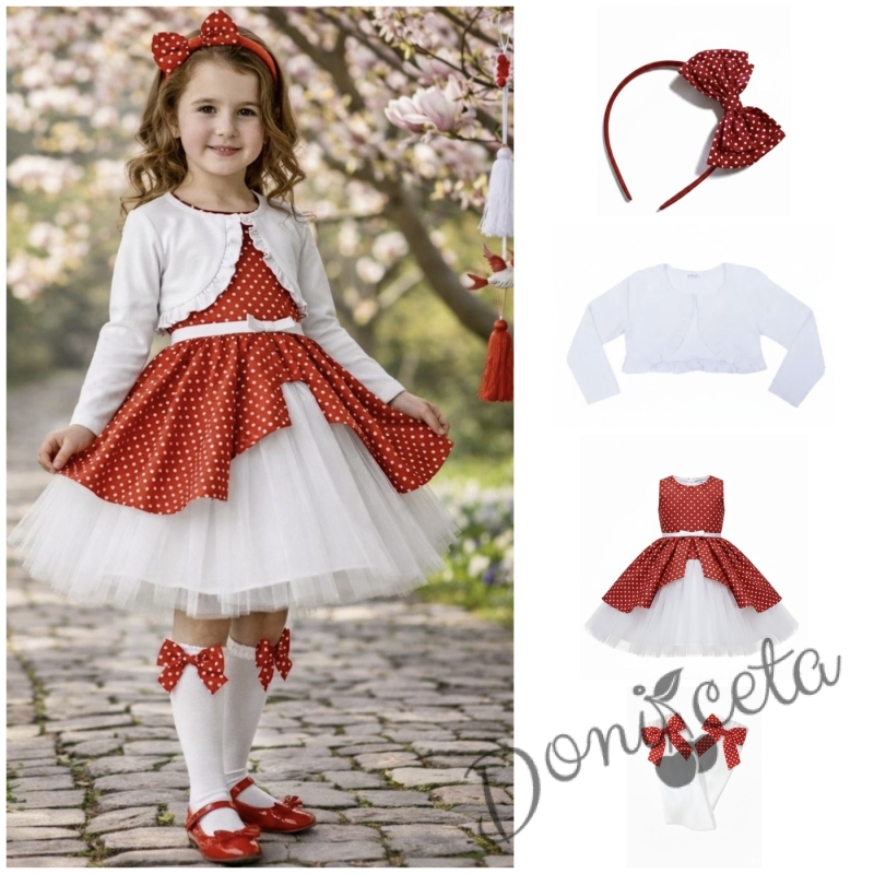Официален комплект от 4 части- рокля Надежда в червено на бели точки с тюл в бяло, болеро в бяло, диадема в червено на бели точки и чорапи с червени панделки на бели точки