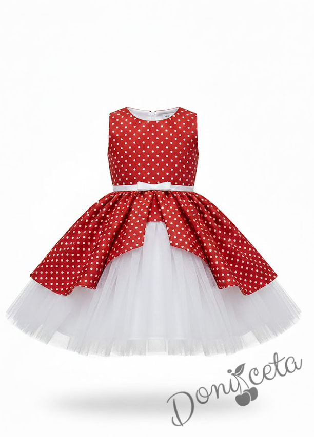 - Много красива и богата детска официална рокля с тюл в червено на бели точки. Рокличката е без ръкав изцяло клош надолу, който е с богат тюл в бяло и изглежда много празнично отпред има нежно коланче с панделка в бяло, а отзад роклята се закопчава с цип.