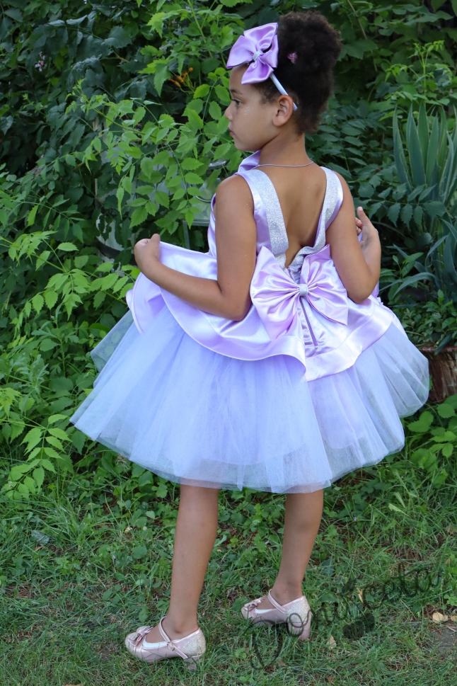 Официална детска рокля с панделка от сатен, и тюл в долната част на роклята с гол гръб и малка чантичка в цвят лилаво 309СЛ