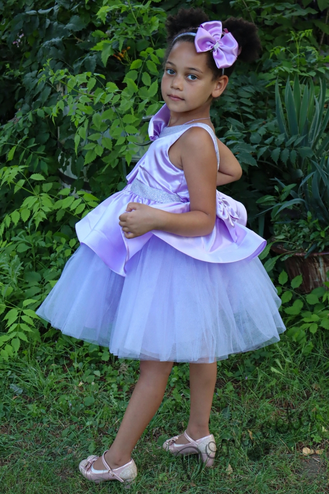 Потопете се в света на изяществото с нашата официална детска рокля, изработена от нежен сатен и тюл в лилаво. Тази рокля е идеалният избор за специални поводи, където вашето момиченце ще заблести.