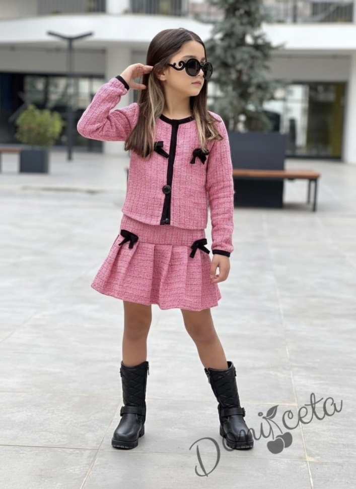 Комплект за момиче от 2 части - Сако в розово с панделки и плисирана пола