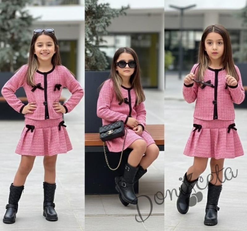 Комплект за момиче от 2 части - Сако в розово с панделки и плисирана пола