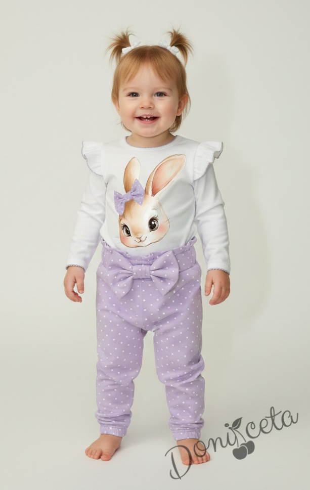 Бебешки комплект от 2 части – боди с дълъг ръкав в бяло с къдрички и лилав кант, панталон в светлолилаво на бели точки с панделка на ластика.
