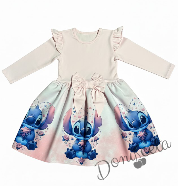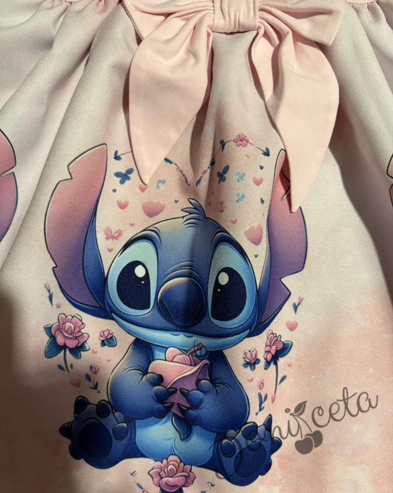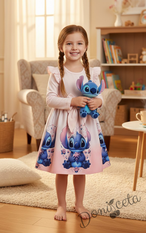Детска рокля Стич с дълъг ръкав в цвят розов с къдрички и панделка