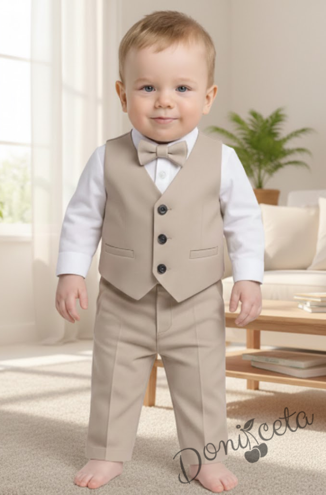 Бебешки официален комплект от 4 части- боди-риза в бяло, панталон, елек и папийонка в бежово