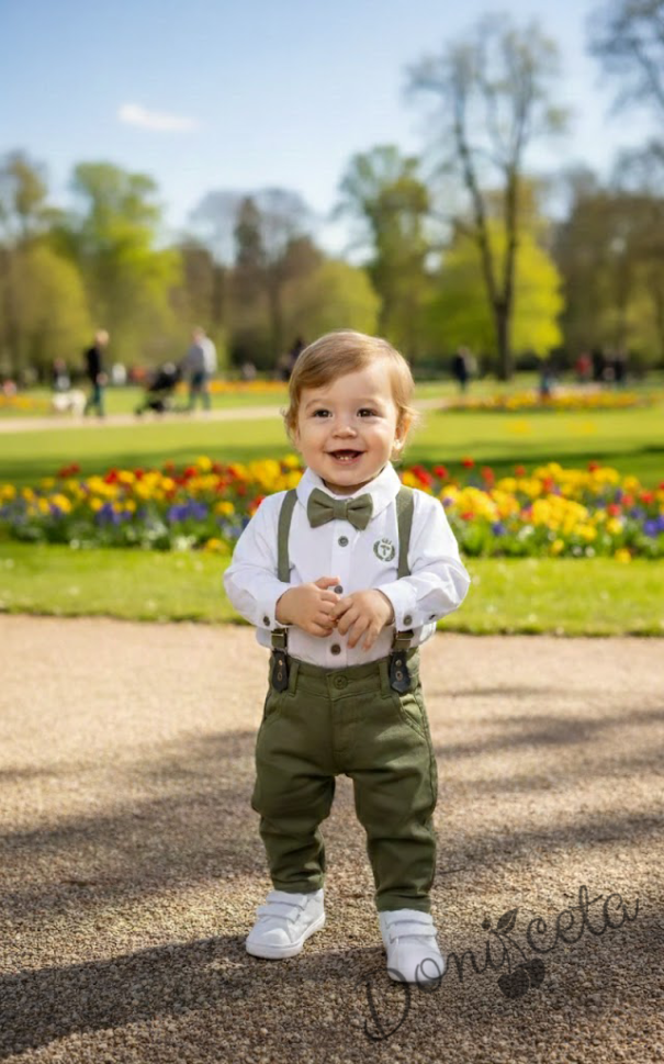 • Много стилен бебешки комплект за момче от ризка в бяло, панталон в зелено, тиранти и папийонка.