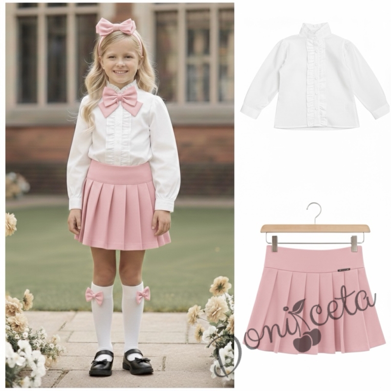Комплект за момиче от 2 части - розова пола от трико Тамара и риза с дълъг ръкав и къдрички