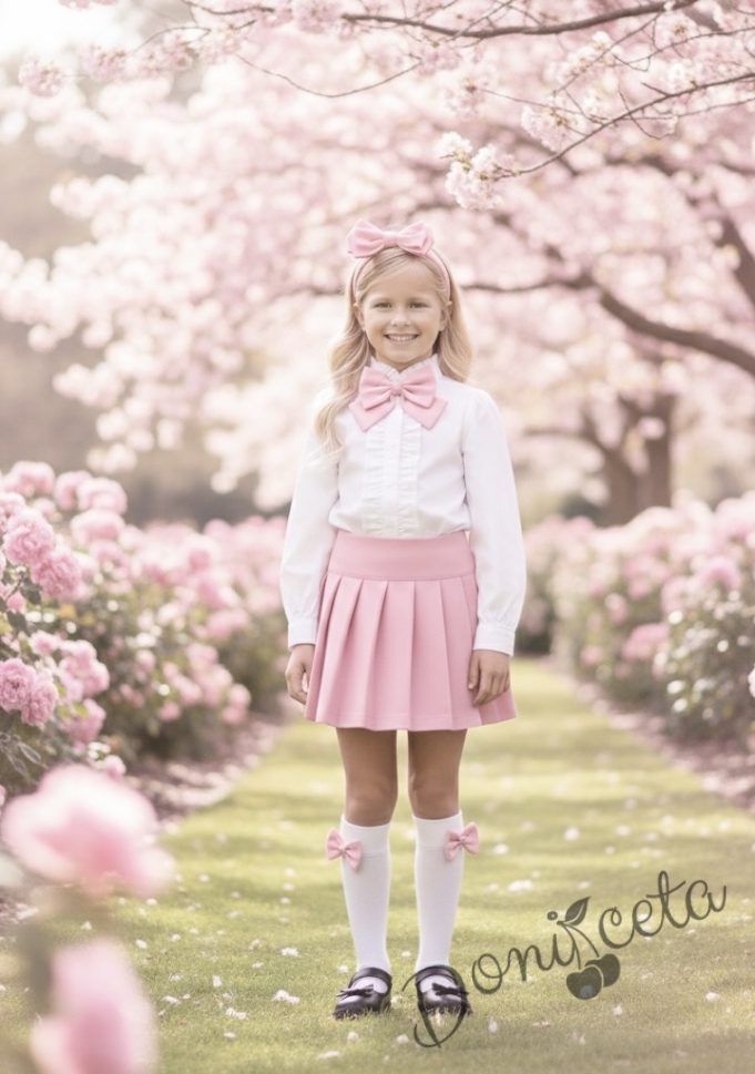 Представяме ви стилен и елегантен комплект за момиче, който комбинира класическа визия с модерен акцент. Комплектът "Тамара" се състои от две части - розова пола и бяла риза с дълъг ръкав и панделка, създавайки перфектната комбинация за всеки специален повод или за ежедневно носене.