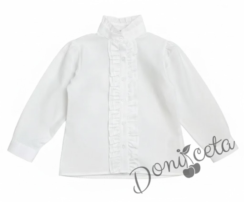 Ризата с дълъг ръкав скласически дизайн и нежни къдрички по предната част, ризата добавя нотка на изтънченост и романтика към всяко облекло. Дългите ръкави я правят подходяща за прохладните дни, а висококачествената материя гарантира, че вашата дъщеря ще се чувства удобно през целия ден. .