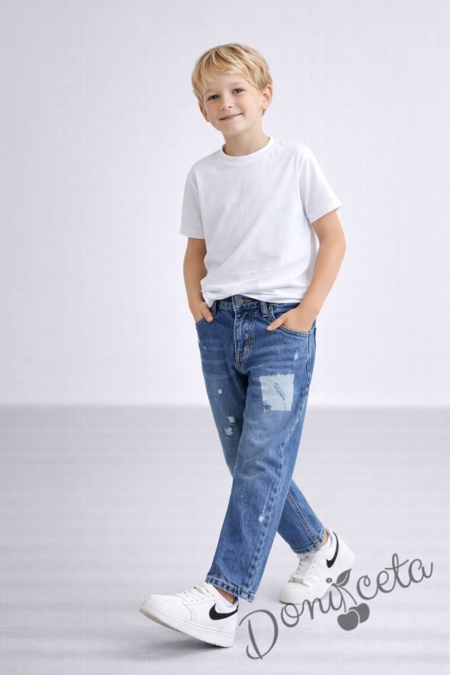 Детски комплект за момче от блуза в бяло и дълги дънки в светлосиньо