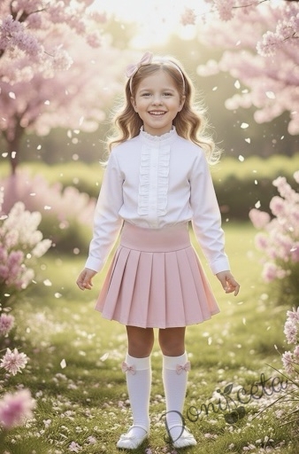 Комплект за момиче от 2 части-пола Тамара от трико в розово и риза с дълъг ръкав и къдрички в бяло