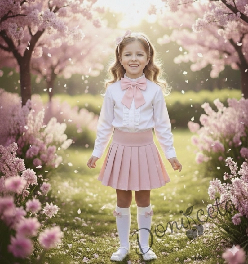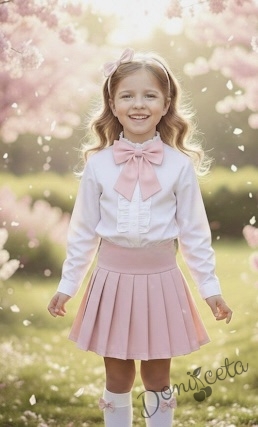 Комплект за момиче от 3 части-пола Тамара от трико в розово, риза с дълъг ръкав и къдрички в бяло и розова панделка
