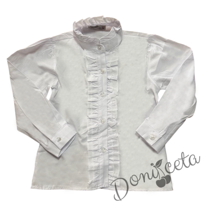 Ризата с дълъг ръкав е в класически бял цвят и е украсена с нежни къдрички отпред, които придават финес и романтичен вид. Високата яка придава елегантен вид на ризата,завършен вид придава красивата трозова панделка, която е поставена на ризата.