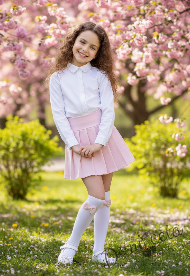 Комплект за момиче от 2 части- пола в розово Тамара от трико и риза с дълъг ръкав в бяло