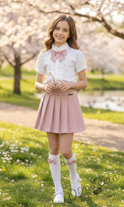 Комплект за момиче от 3 части-пола Тамара от плисе в розово, риза с къс ръкав в бяло с къдрички и панделка в розово