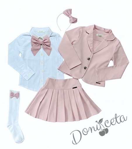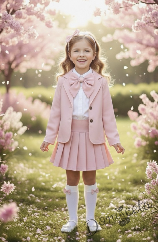 Детски комплект за момиче от 6 части- пола Тамара от трико и плисе в розово, сако, ризка с панделка, диадема и чорапки