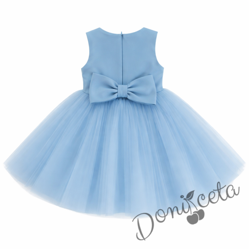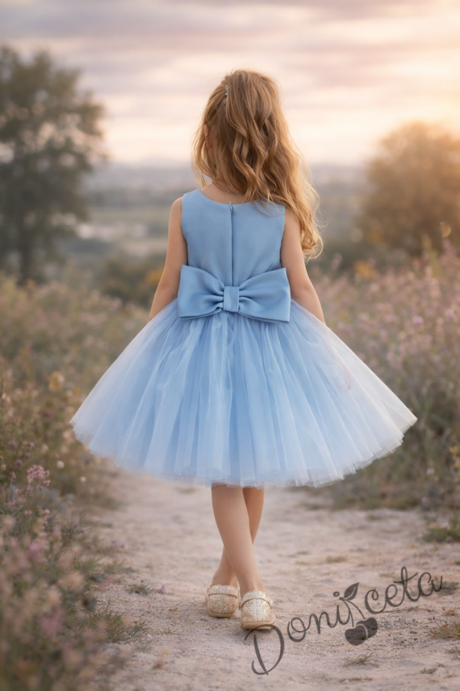 На гърба на роклята има голяма, елегантна панделка, която придава завършен вид на тоалета. Панделката е в същия светлосин цвят като роклята и е перфектният акцент, който привлича вниманието.