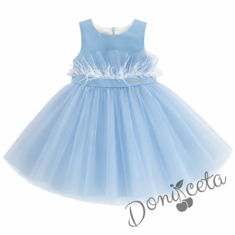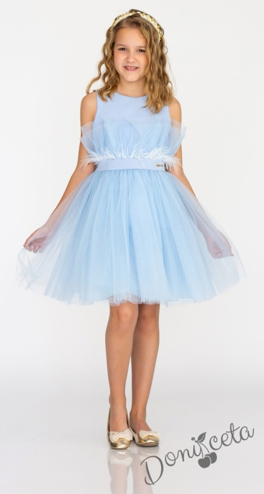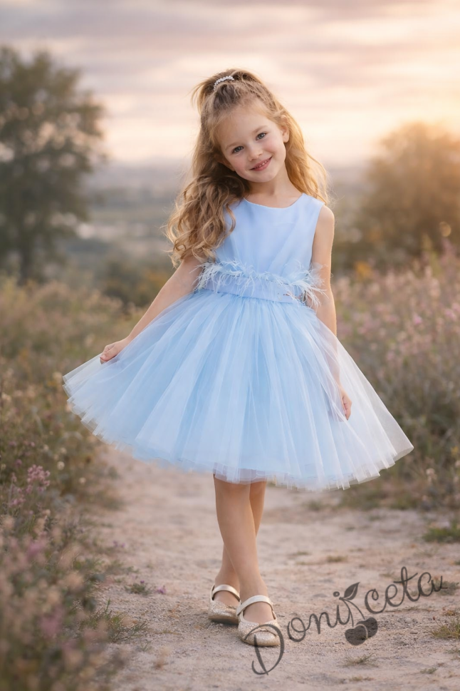 Детска рокля с богат тюл и пера в светлосиньо с панделка Анелия