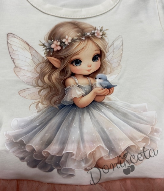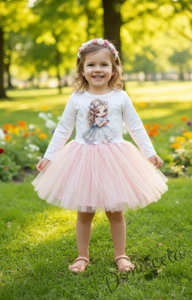 Детска ежедневна рокля с дълъг ръкав в прасковено с картиинка на малка фея