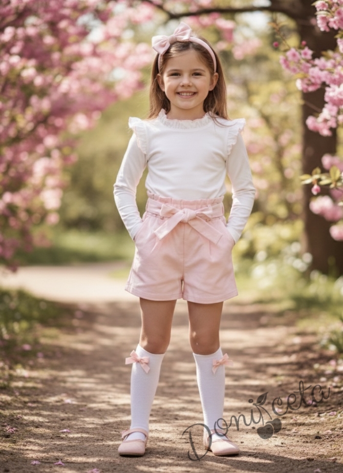 Комплект за момиче от къси панталони в розово и блуза в бяло с дълъг ръкав с къдрички обкрайчени в розово
