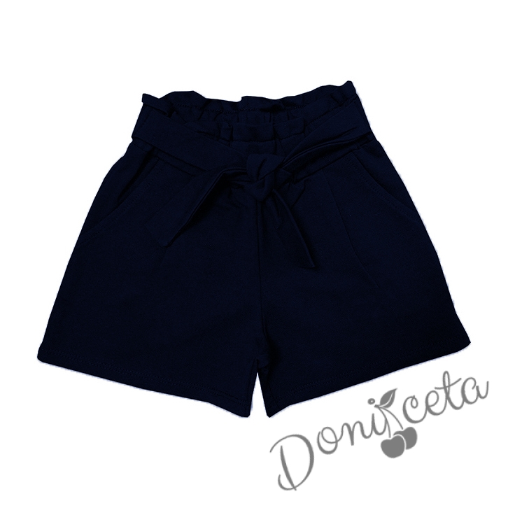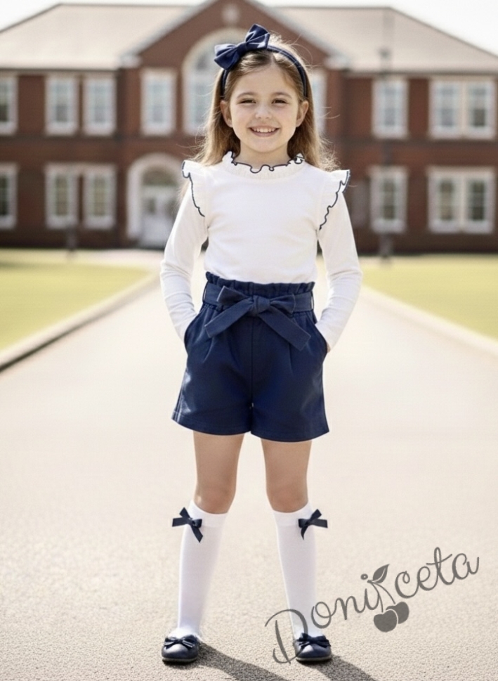 Комплект за момиче от къси панталони в тъмносиньо и блуза в бяло с къдрици с тъмносин кант