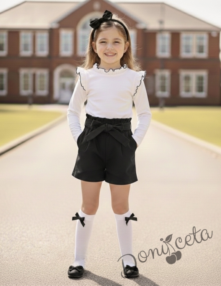 Комплект за момиче от къси панталони в черно и блуза в бяло с къдрици с черен кант