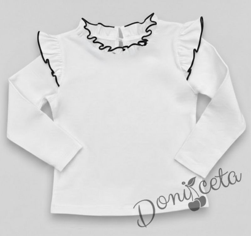 - блуза в бяло с дълъг ръкав и къдрички на рамената с кант в черно