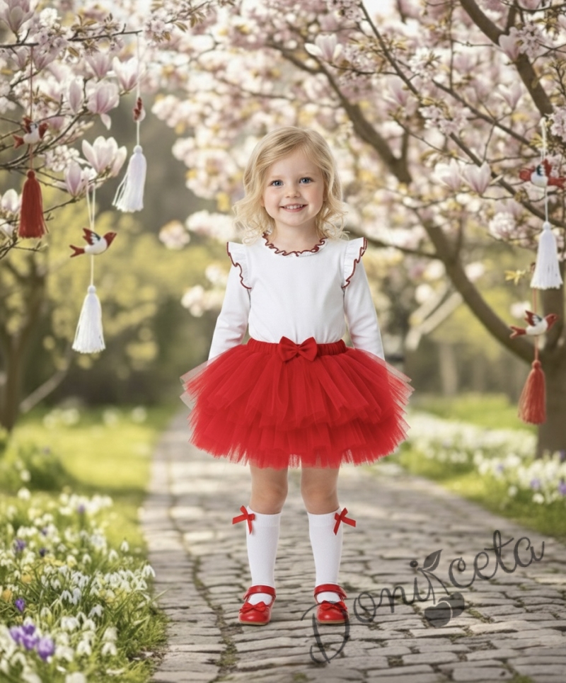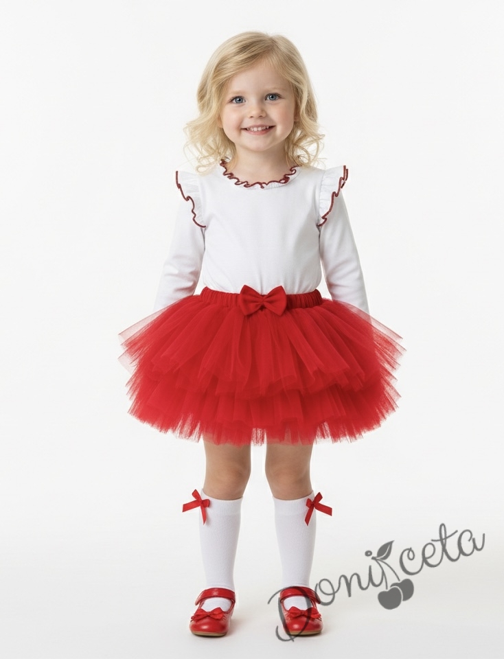 Весел комплект от поличка тип пачка в червено от тюл с блузкас дълъг ръкав в бяло с къдрички на рамената и бието.
