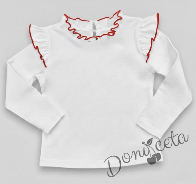 Комплект от 2 части-детска туту пола пачка в червено и блузка с дълъг ръкав в бяло с къдрички на рамената и бието с червен кант