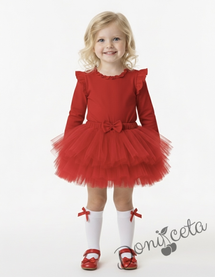 Весел комплект от поличка тип пачка в червено от тюл с блузка с дълъг ръкав в бяло с къдрички на рамената и бието.