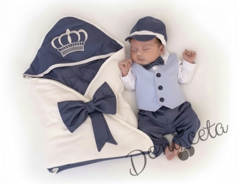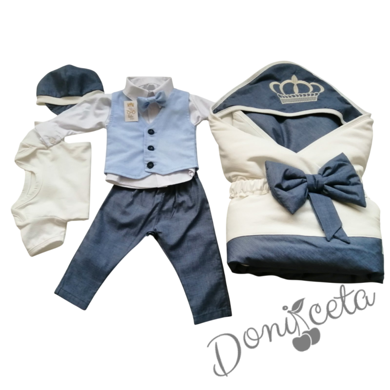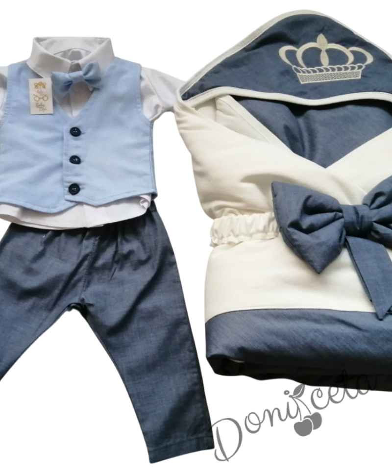 Бебешки елегантен комплект за изписване за момче светлосиньо, бяло и тъмносиньо