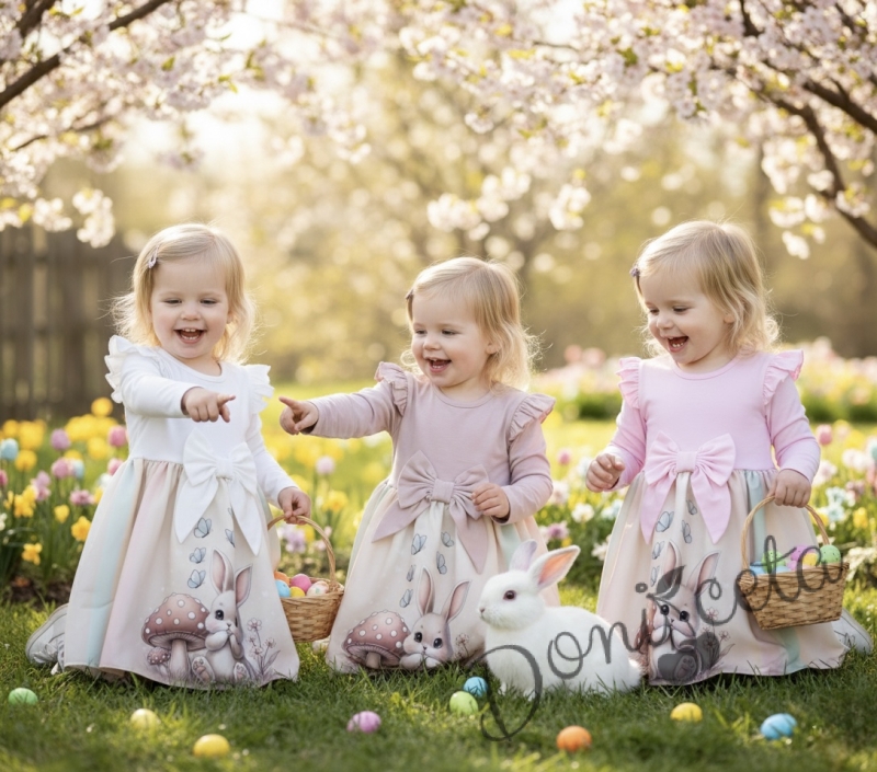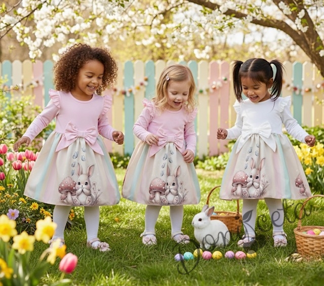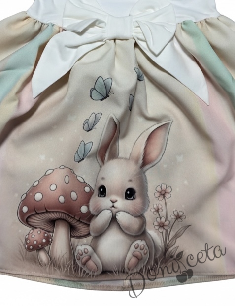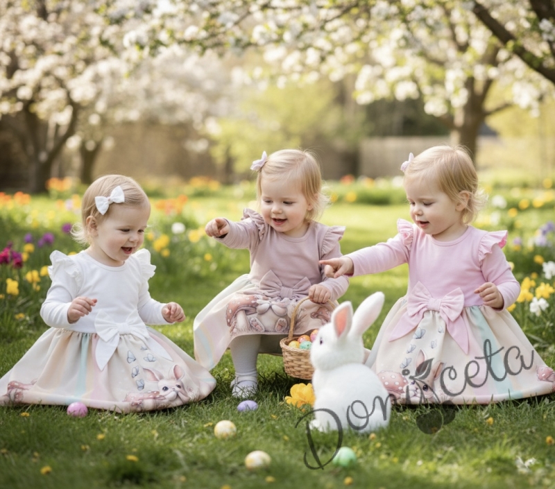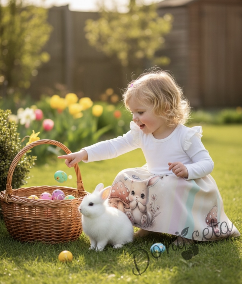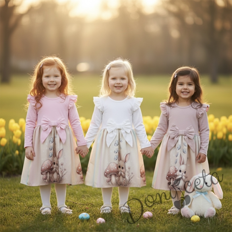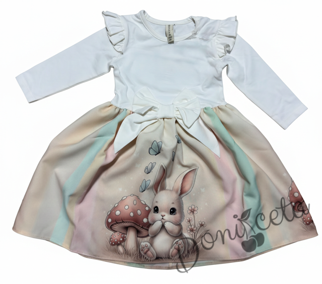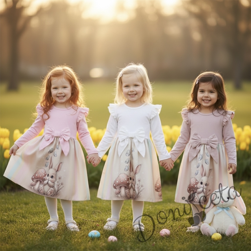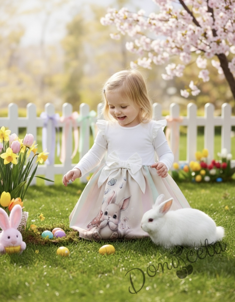 Детска ежедневна или официална рокля с дълъг ръкав в екрю с къдрички, панделка и зайче
