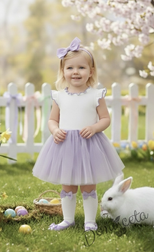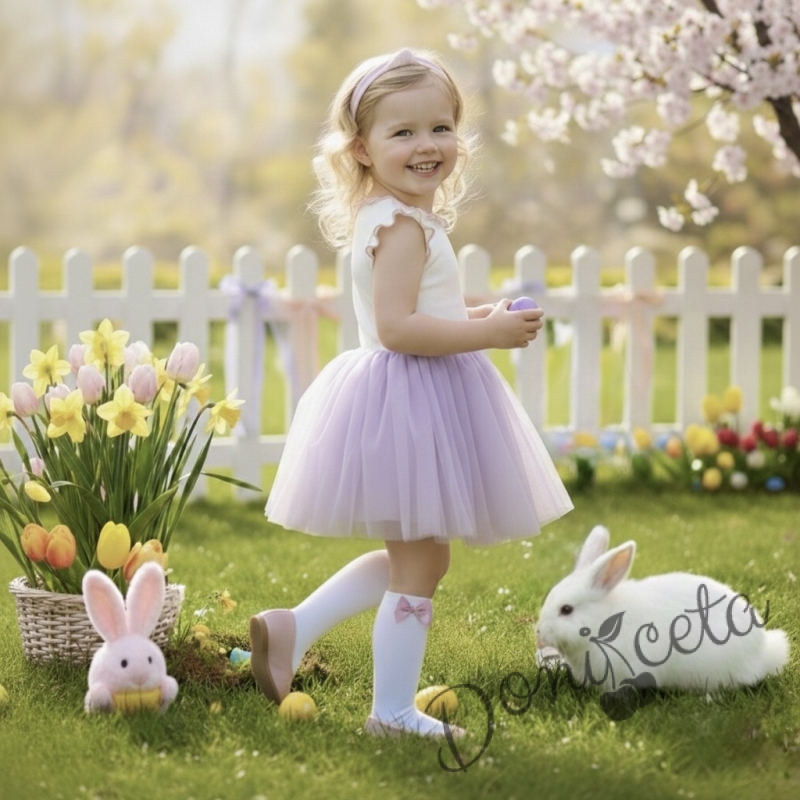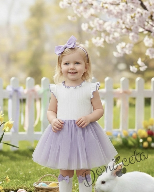 Представяме ви нашата очарователна детска рокля без ръкав, перфектна комбинация от комфорт и елегантност. Тази красива рокля е в нежен цвят екрю, комбиниран с ефирен лилав тюл, което я прави идеална за всяко специално събитие или просто за една красива разходка.