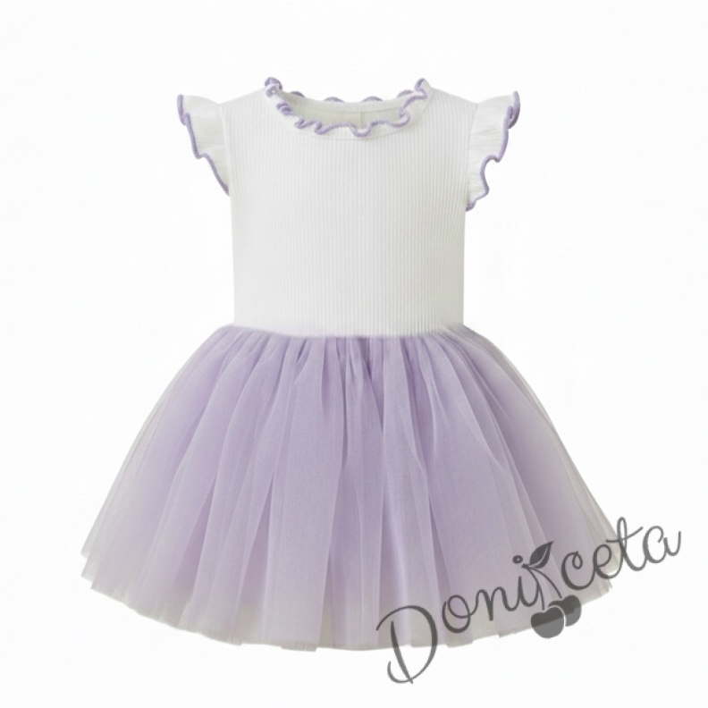 Детска ежедневна рокля без ръкав в бяло и лилаво с къдрички с кант в лилаво на рамената Оливия от колекция Лилавина