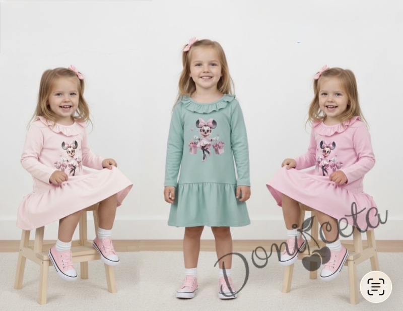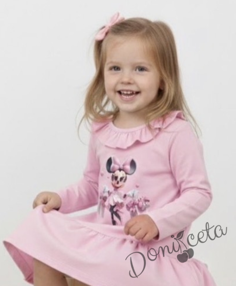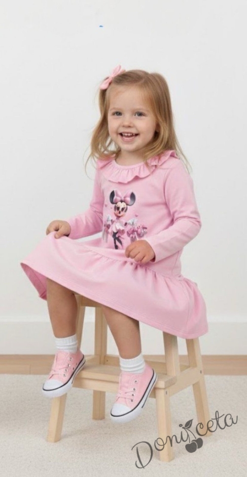 Детска рокля с дълъг ръкав с къдрички на бието в розово с любим герой