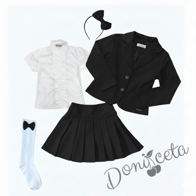Комплект от 5 части пола Гери, сако в черно, ризка в бяло с къс ръкав, чорапи с панделки и диадема
