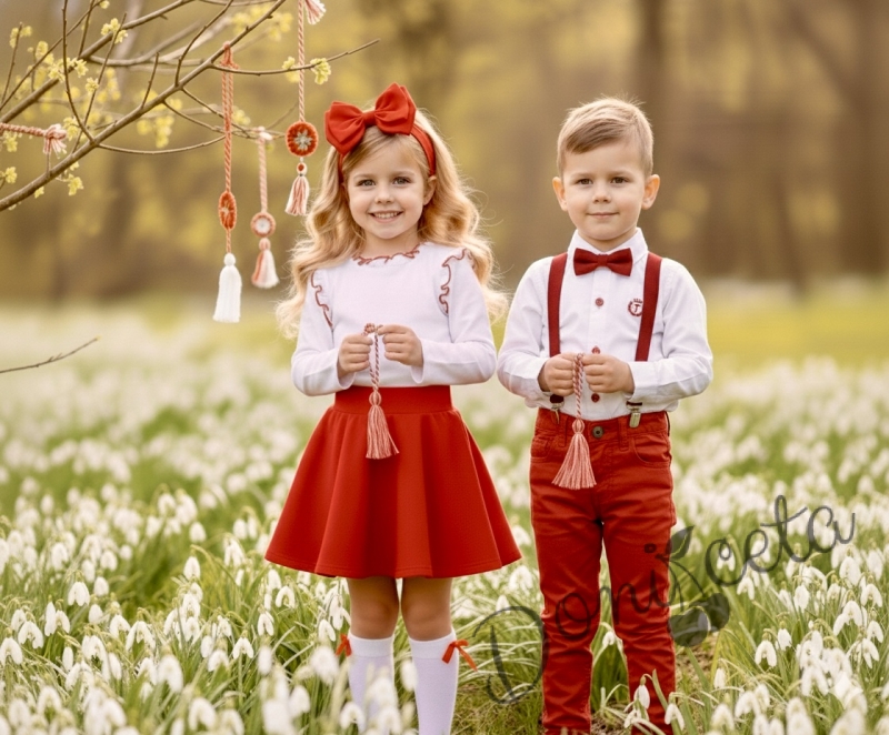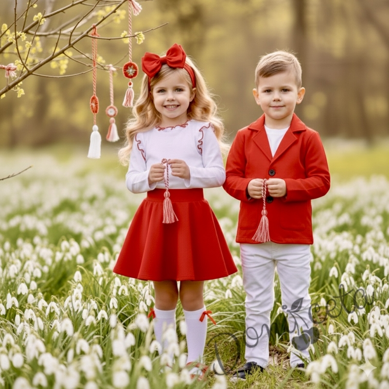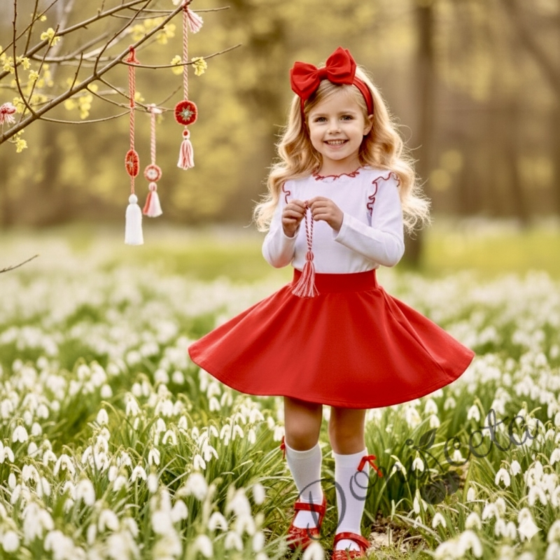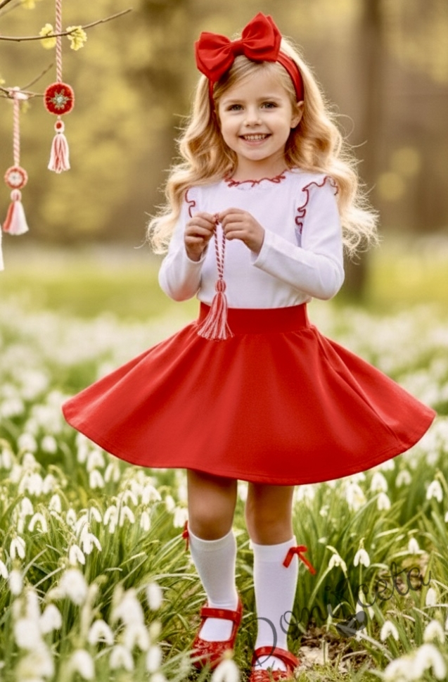 Комплект за момиче от 3 части-пола клош от трико Роси в червено, блуза с дълъг ръкав с къдрички в бяло обкрайчени с червено iи чорапки
