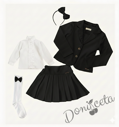Комплект от 5 части пола Гери, сако в черно, ризка в бяло с дълъг ръкав, чорапи с панделка в черно и диадема