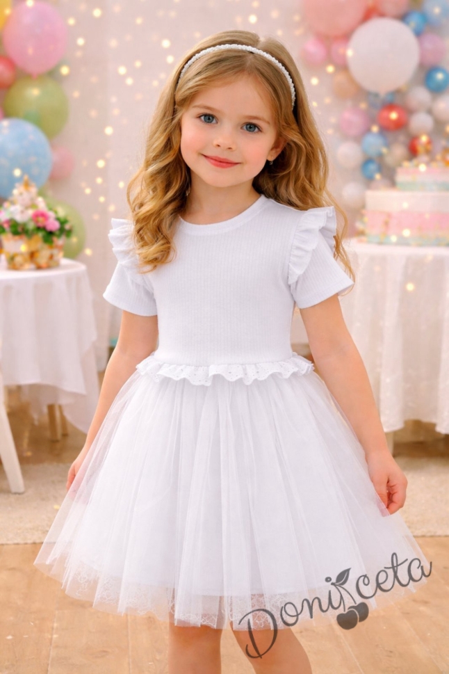 Детска официална или ежедневна рокля с къс ръкав в бяло с къдрички на рамената