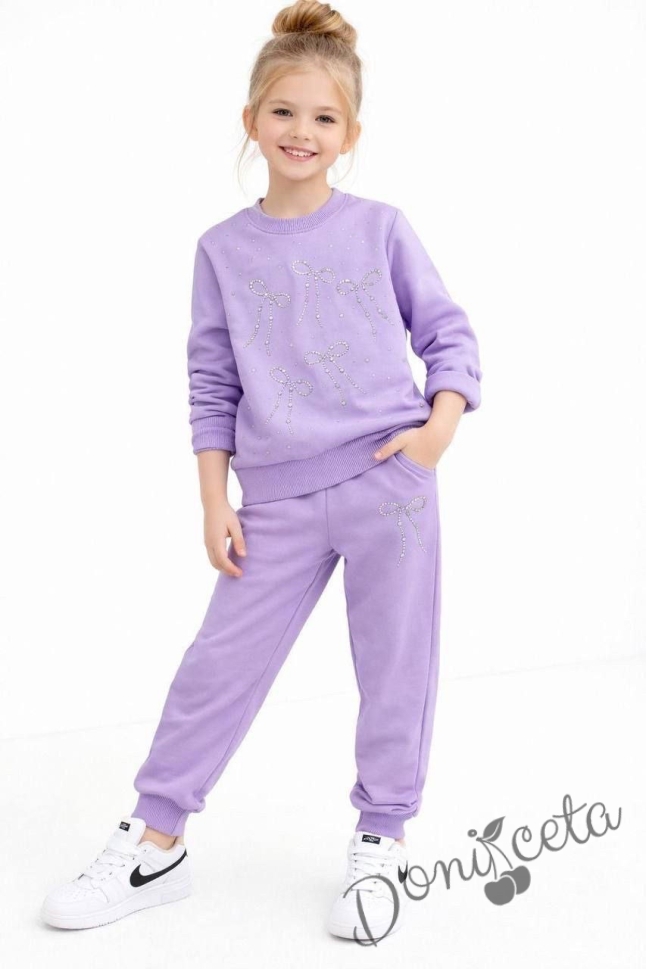 Спортен комплект за момиче от горнище и долнище в лилаво с панделки