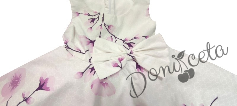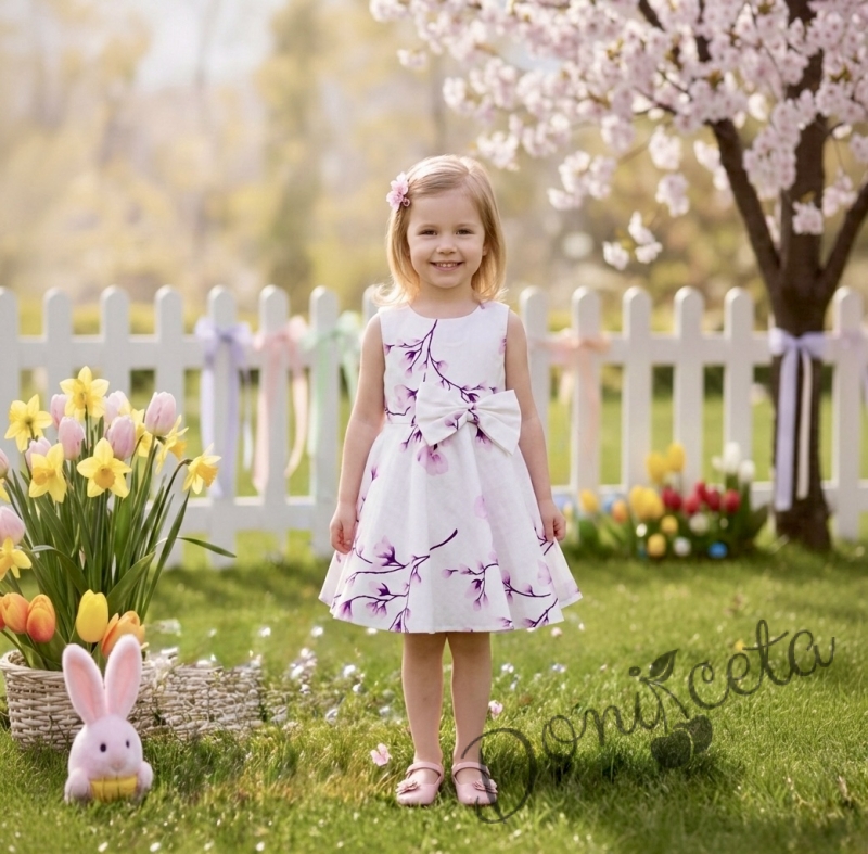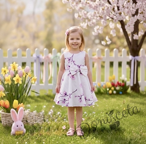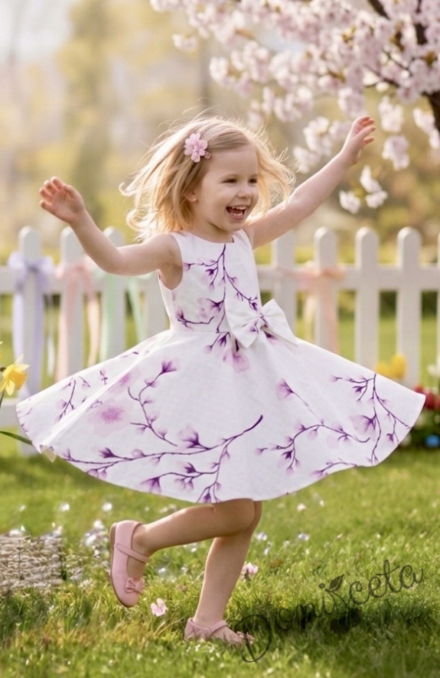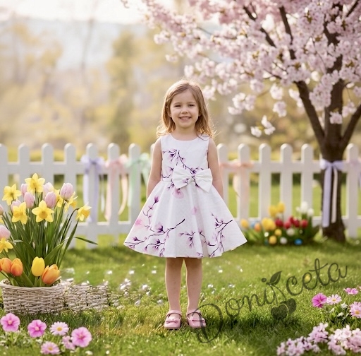 • Изключително красива и богата детска памучна рокля в бяло на нежни лилави цветя.